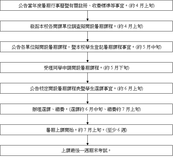 1. 每年大約在四月上旬公告暑期行事曆及有關選課、收費標準暨暑期授辦法。
